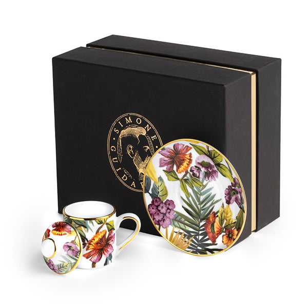 The Exotic Jungle collection of porcelain dishes and accessories is presented in an elegant padded gift box finished with edging, the Simone Guidarelli logo, and gold-printed details.