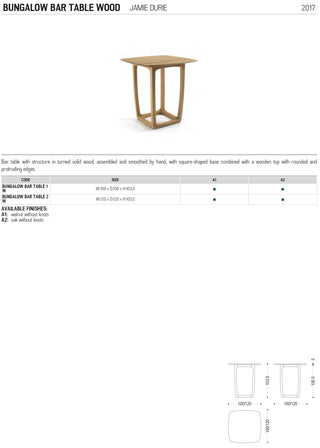 Bar table with structure in turned solid wood, assembled and smoothed by hand, with square-shaped base combined with a wooden top with rounded and protruding edges.