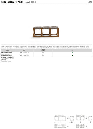 Bench with structure in solid teak wood turned, assembled and sanded completely by hand. The seat is characterized by interwoven strips of outdoor fabric.