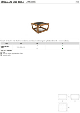 Side table with structure made of solid teak wood, turned, assembled and sanded completely by hand, combined with a recessed marble top.