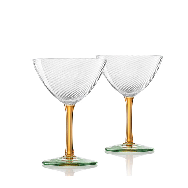 The delicate Amber and Parfum Green hues enhance the transparency of the glass, while the Torse texture—a classic Murano technique—creates a refined diamond-pattern relief that plays beautifully with light.