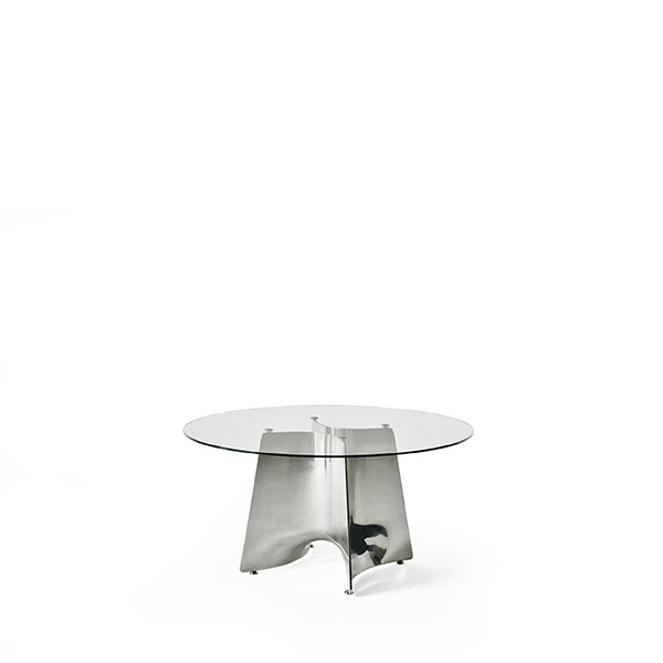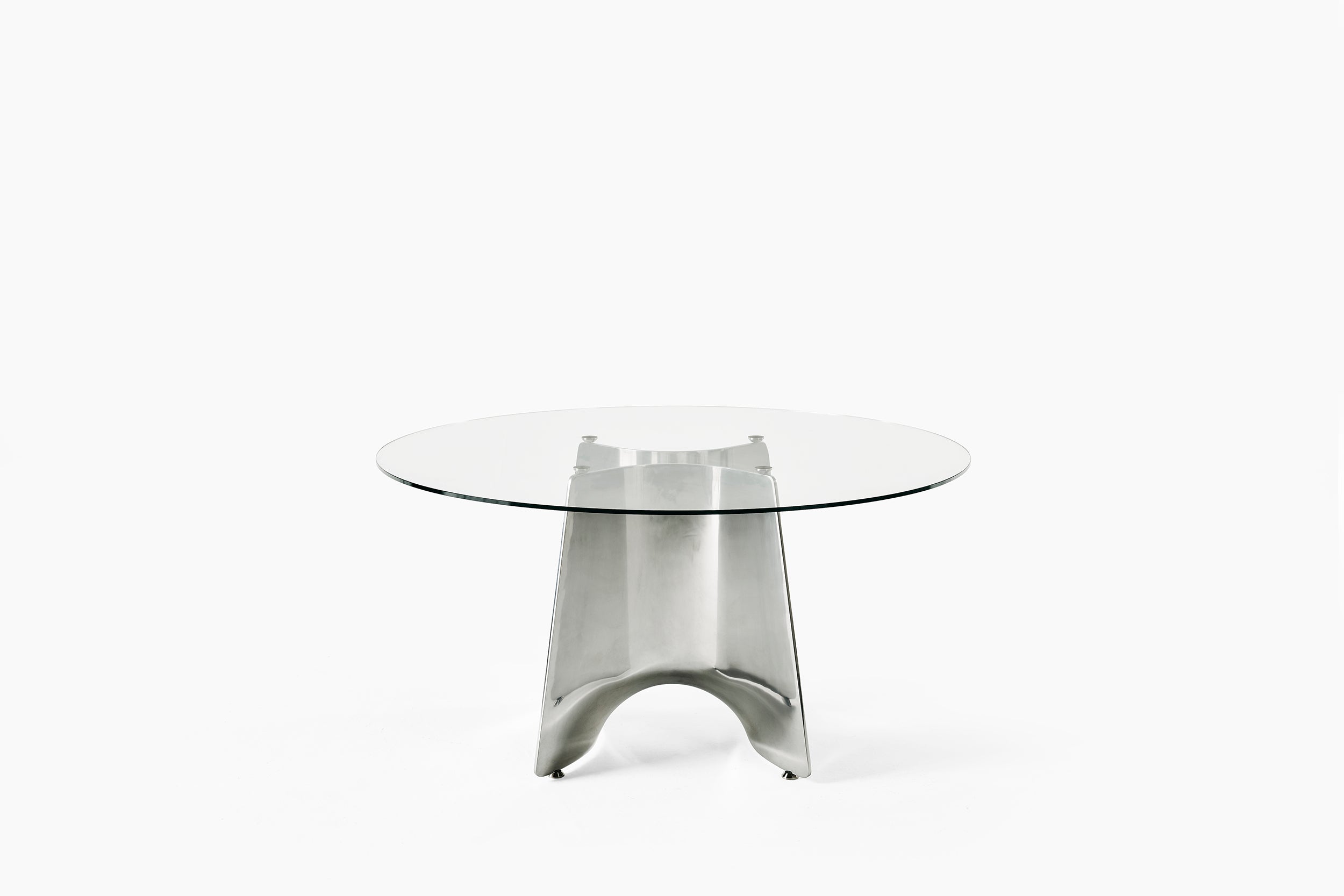 Table with cast aluminum base and transparent tempered glass top (10 mm thick).