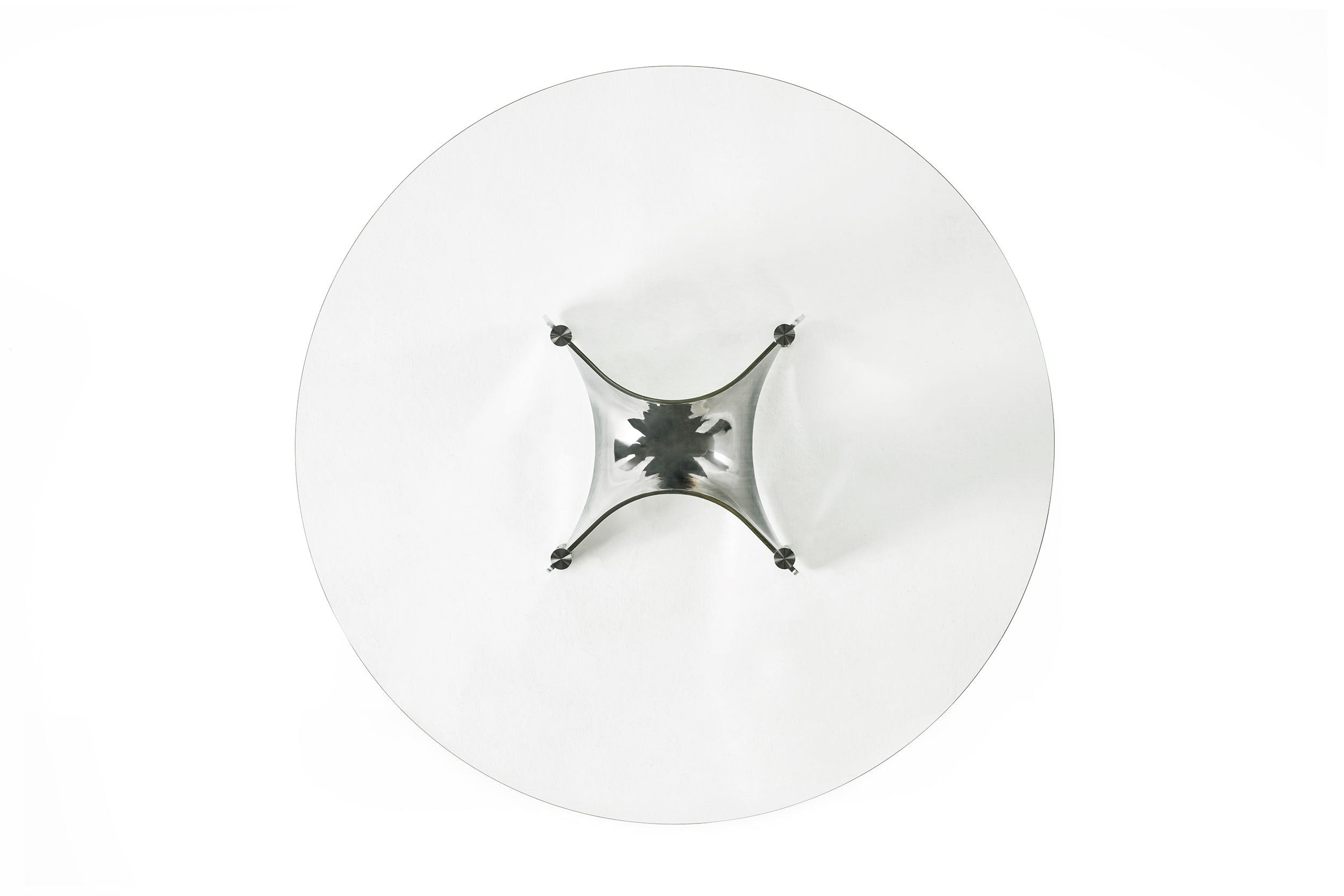 The base of the Bentz table emerges from a profile that extends along a fluid line, forming a central focal point with the functional features of a column base. This configuration balances rationality and warmth, creating a visual harmony that combines a rigorous aesthetic with expressive details. Designed to encourage natural interaction, Bentz is completed by a reflective surface that echoes its surroundings, emphasizing its connection with the space. More than just a furnishing, Bentz is a shared experience, blending design and function to promote a new culture of daily living: essential, open, and sustainable.