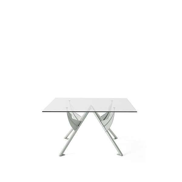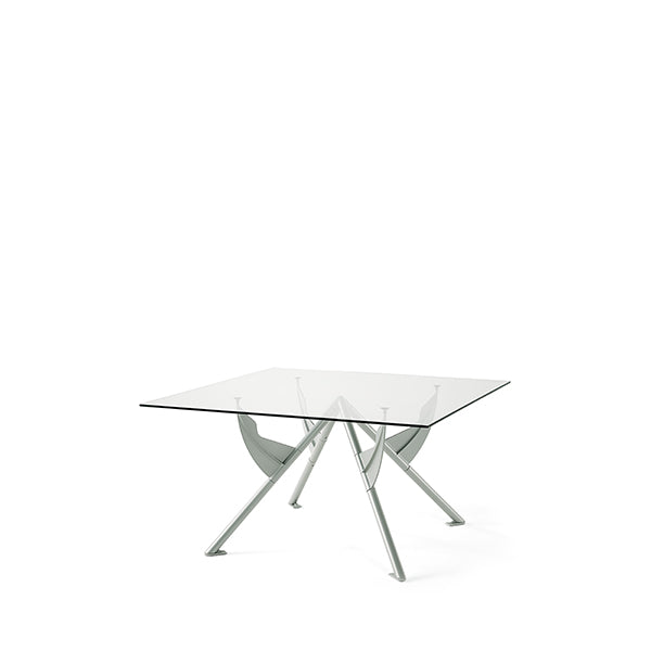 President M is a line of tables with a disassemblable and recyclable structure. The structure has three or four legs, depending on the model, and is available in metallic silver or matt black. The glass top is offered in various sizes.
