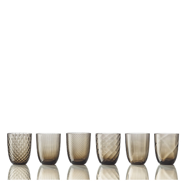 A refined set of 6 hand-blown water glasses in amber glass, each featuring a different traditional texture. Designed and crafted in Italy by NasonMoretti, part of the Idra Collection.
