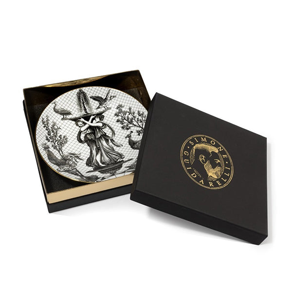 The Souvenirs de Voyage  collection of porcelain dishes and accessories is presented in an elegant padded gift box finished with edging, the Simone Guidarelli logo, and gold-printed details.