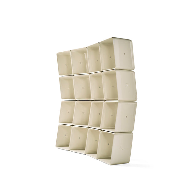 Side table, storage unit, bookshelf, wall: Obo is a modular system based on the repetition and combination of individual elements, offering innovative solutions for object storage and space division. Intelligent, versatile, and playful, the asymmetric design of each module allows for the creation of multifaceted and articulated compositions in three dimensions. Made from 50% recycled plastic and 100% recyclable, Obo is the perfect representation of the brand's commitment to sustainability.