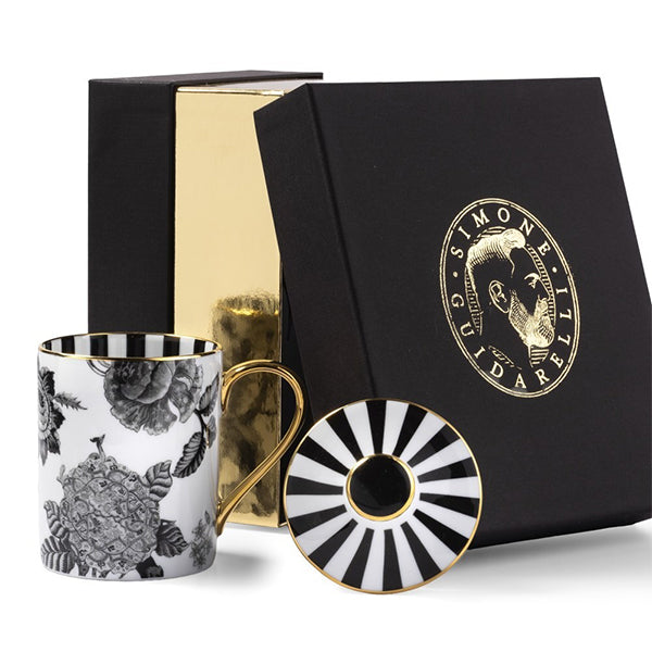 The Souvenirs de Voyage collection of porcelain dishes and accessories is presented in an elegant padded gift box finished with edging, the Simone Guidarelli logo, and gold-printed details.