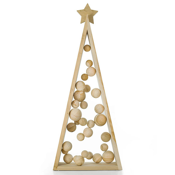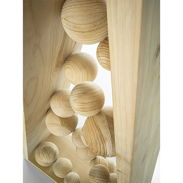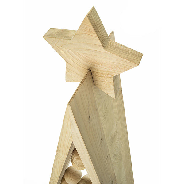 Oversized version of the XMAS_AD pine tree. A 185cm-tall piece of furniture made entirely of fragrant Cedar wood, whose structure features an ordered geometric outer frame. Inside, 30 spheres are arranged asymmetrically, creating a dynamic visual contrast to the linearity of the frame. A star is placed on top to complete the design.