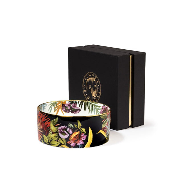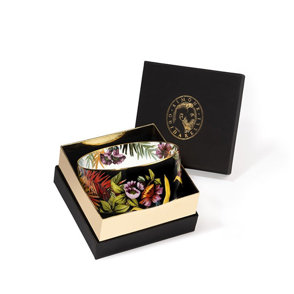The Exotic Jungle collection of porcelain dishes and accessories is presented in an elegant padded gift box finished with edging, the Simone Guidarelli logo, and gold-printed details.
