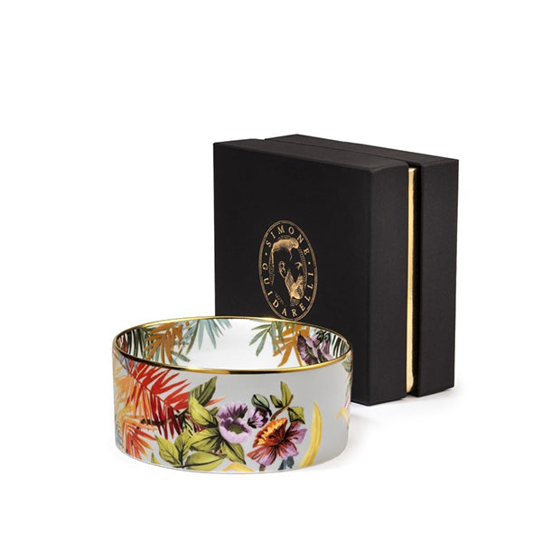 The Exotic Jungle collection of porcelain dishes and accessories is presented in an elegant padded gift box finished with edging, the Simone Guidarelli logo, and gold-printed details.