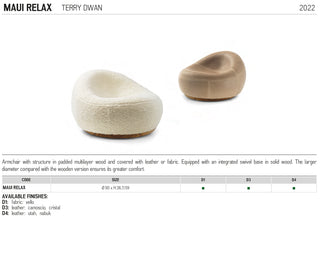 Poltrona con scocca in legno multistrato imbottita e rivestita in pelle o tessuto. Provvista di basamento girevole integrato. Il diametro maggiore rispetto alla versione in legno ne garantisce un maggiore comfort.