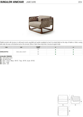 Poltrona imbottita con struttura realizzata in legno massello completamente tornita, assemblata e levigata a mano. Un intreccio di stringhe di pelle o tessuto caratterizza la seduta, lo schienale e i braccioli. Nella versione in tessuto previsto rinforzo strutturale all’interno del rivestimento.