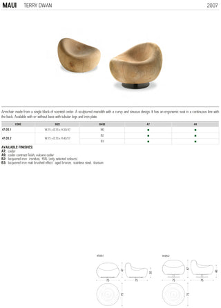 Poltrona in legno massello di cedro profumato lavorata da un blocco unico. Si tratta di un monolite scultoreo dal design curvilineo e sinuoso caratterizzato da una seduta ergonomica in linea di continuità con lo schienale. Disponibile nella versione con o senza basamento con gamba tubolare e piastra in ferro.