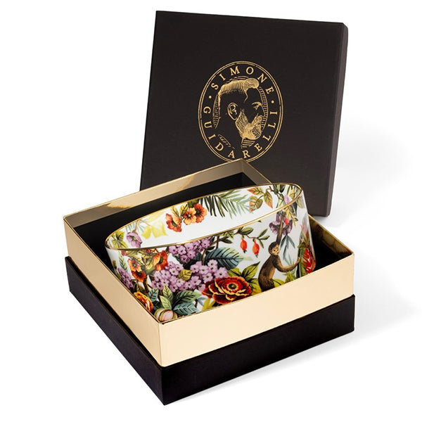 The Exotic Jungle collection of porcelain dishes and accessories is presented in an elegant padded gift box finished with edging, the Simone Guidarelli logo, and gold-printed details.