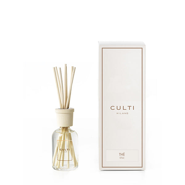 Glass bottles with ivory-coloured labels and cap in natural maple wood. The aesthetic character of the CULTI STILE line evokes purity and elegance. Thé: Soaking in the meditative warmth of a bath tub filled with Japanese green tea. Vapours rise hypnotically off the water, delicately diffusing and filling the room with the aroma of tea leaves.