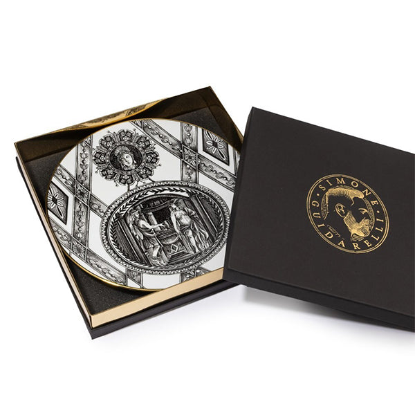 The Souvenirs de Voyage  collection of porcelain dishes and accessories is presented in an elegant padded gift box finished with edging, the Simone Guidarelli logo, and gold-printed details.